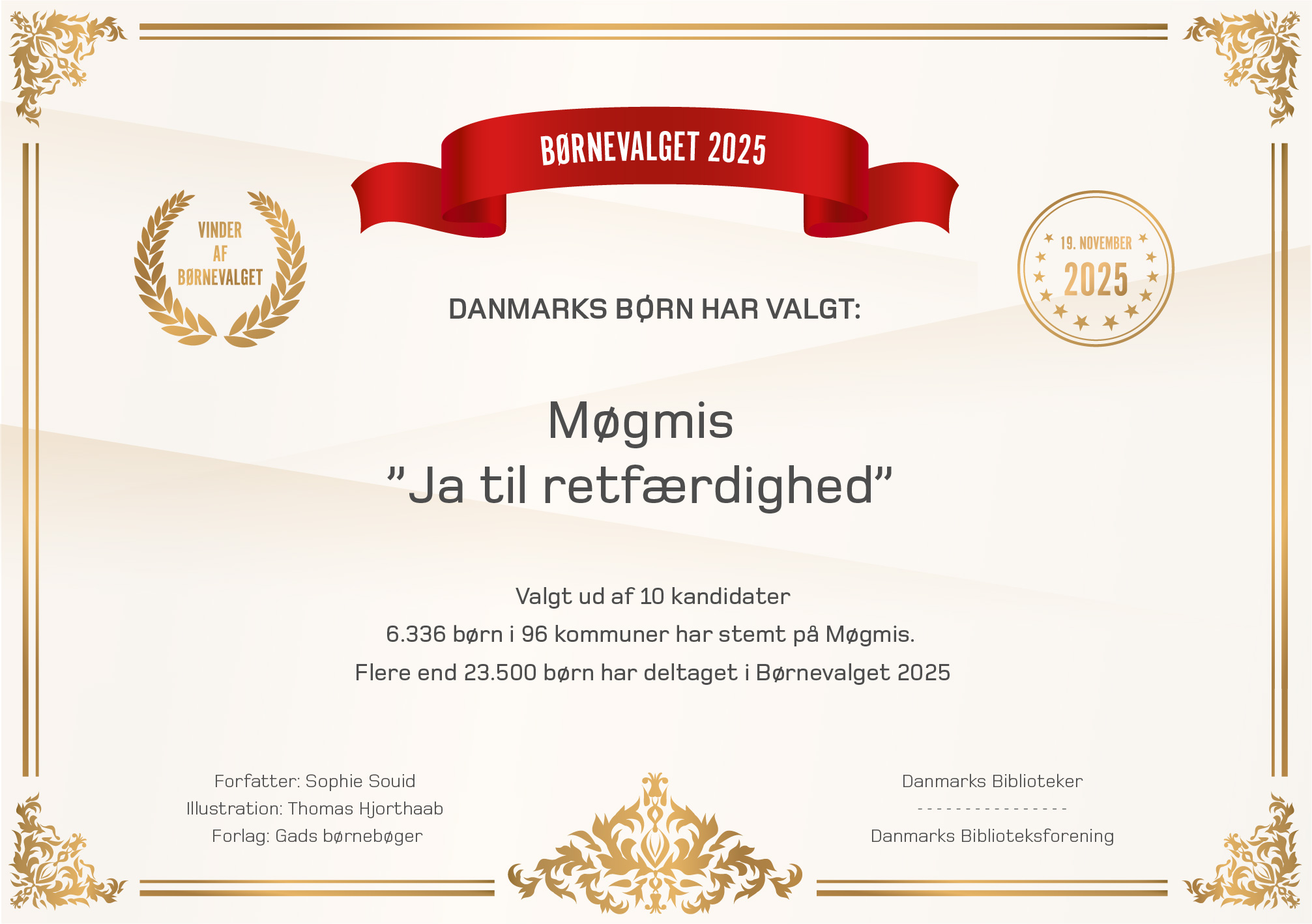 Med sloganet ”Ja til retfærdighed” løber Møgmis med sejren ved bibliotekernes Børnevalg 2025, der giver børn i hele landet mulighed for at opleve, hvad demokrati og valg handler om.